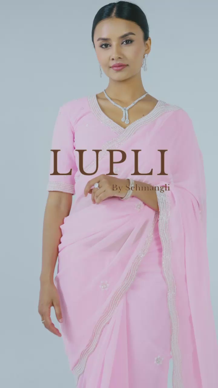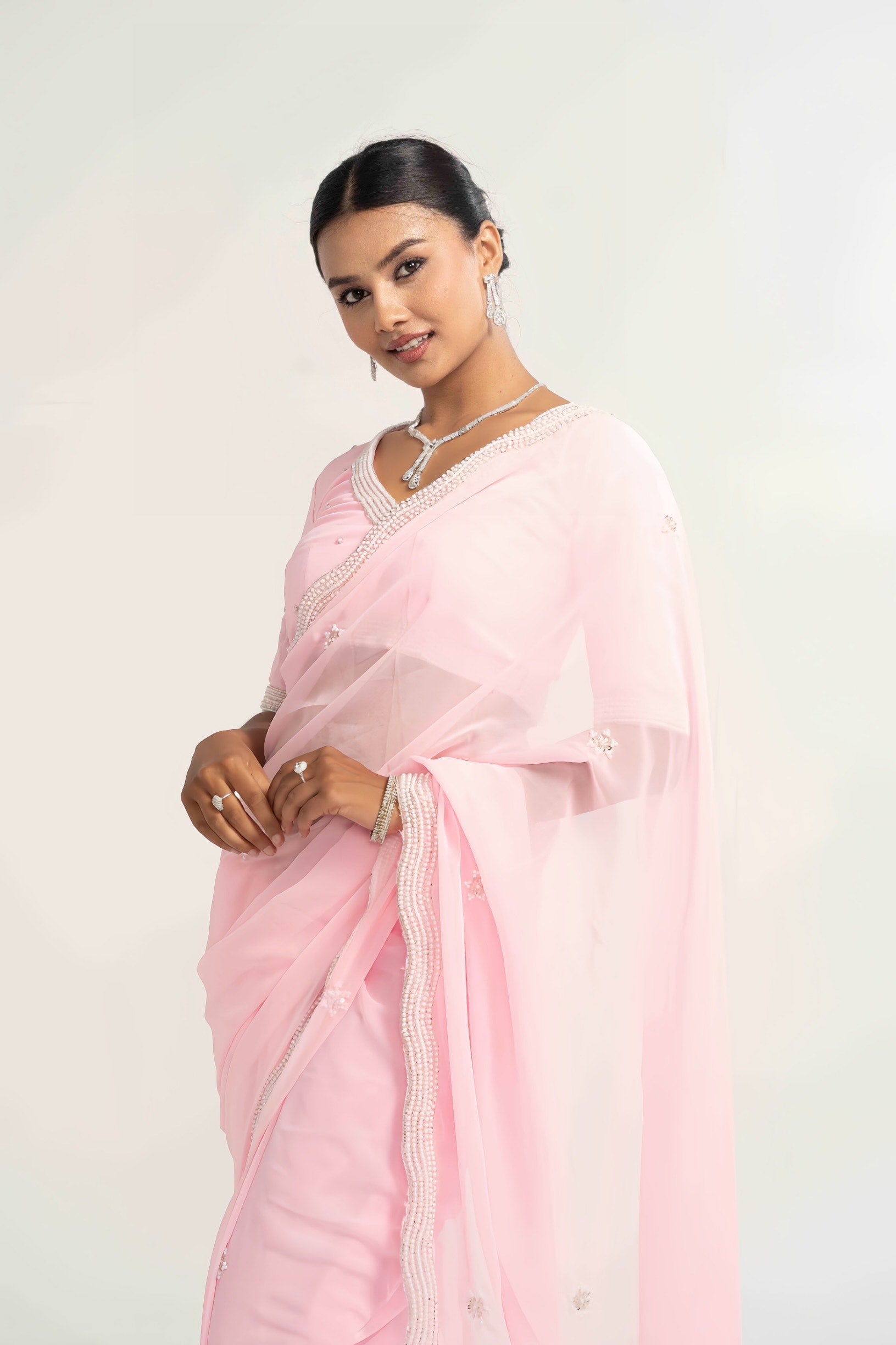 Soft, graceful and full of meaning. Sadhana means devotion, crafted from soft georgette and detailed with delicate hand embellished beads and pearls. This baby pink saree brings elegance to any traditional celebration.