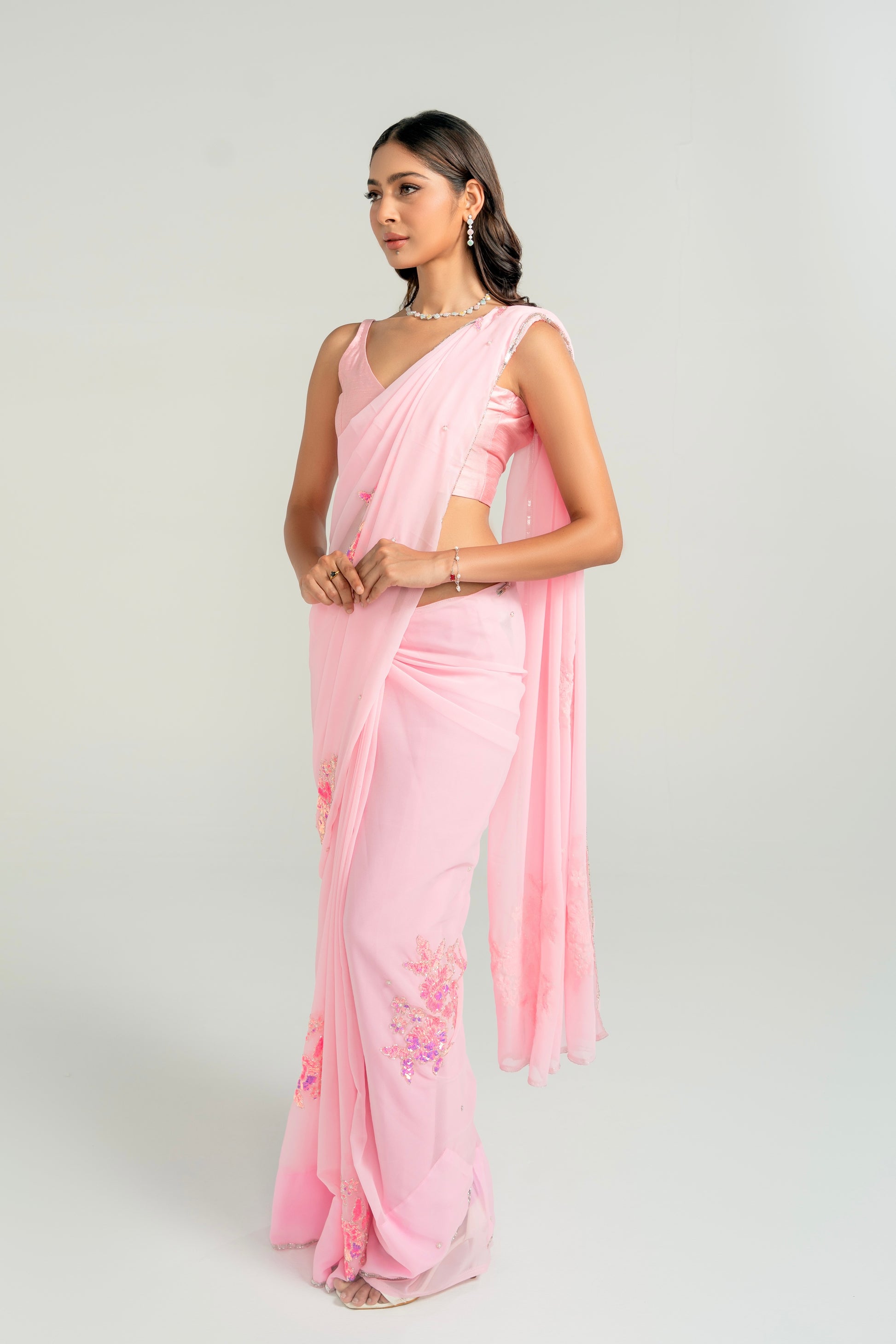 Saral meaning simple, effortless. This baby pink saree delicately hand embellished with beads and sequins. This saree is made to flow with you, elegant, effortless and full of feelings.