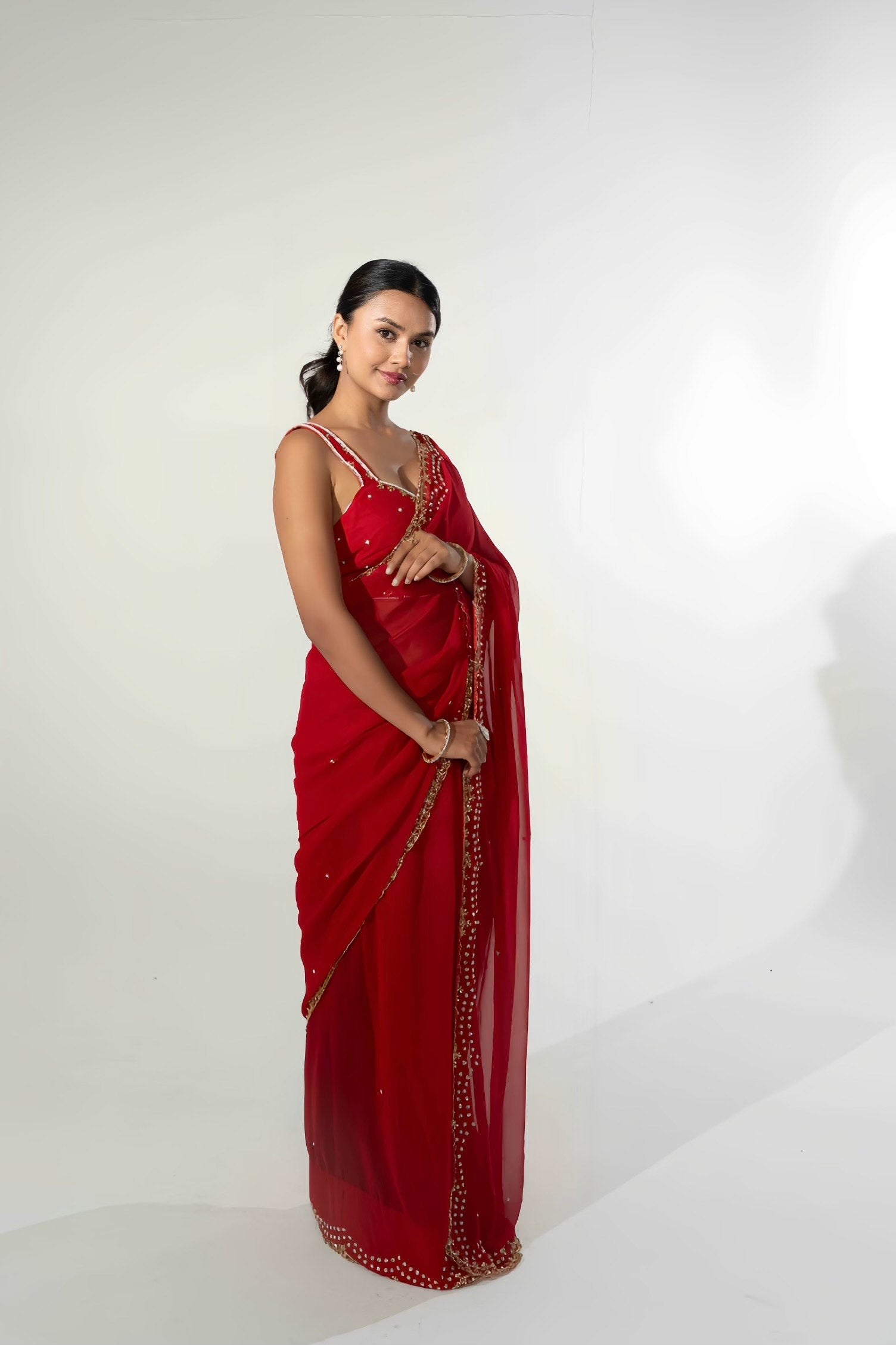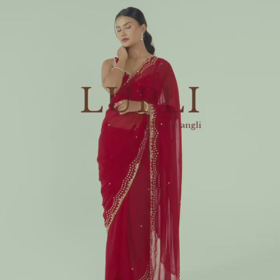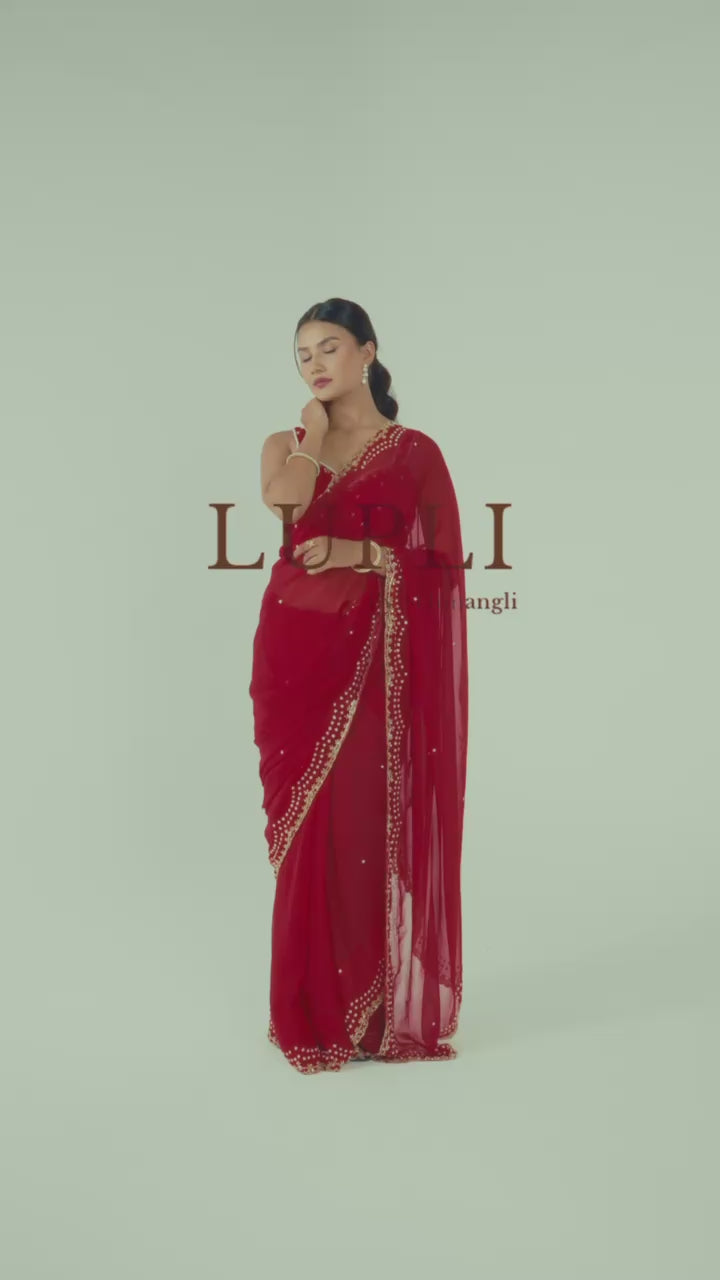 Mimma inspired by the Nepali word Mayalu. This red saree is a celebration of love and tradition. Delicately hand embellished with sequins, beads and baby pearls. Weather you're dressing for weddings, religious rituals or festive occasions, Mimma makes every moment feel meaningful. Mimma is designed to honour your most lovable self.