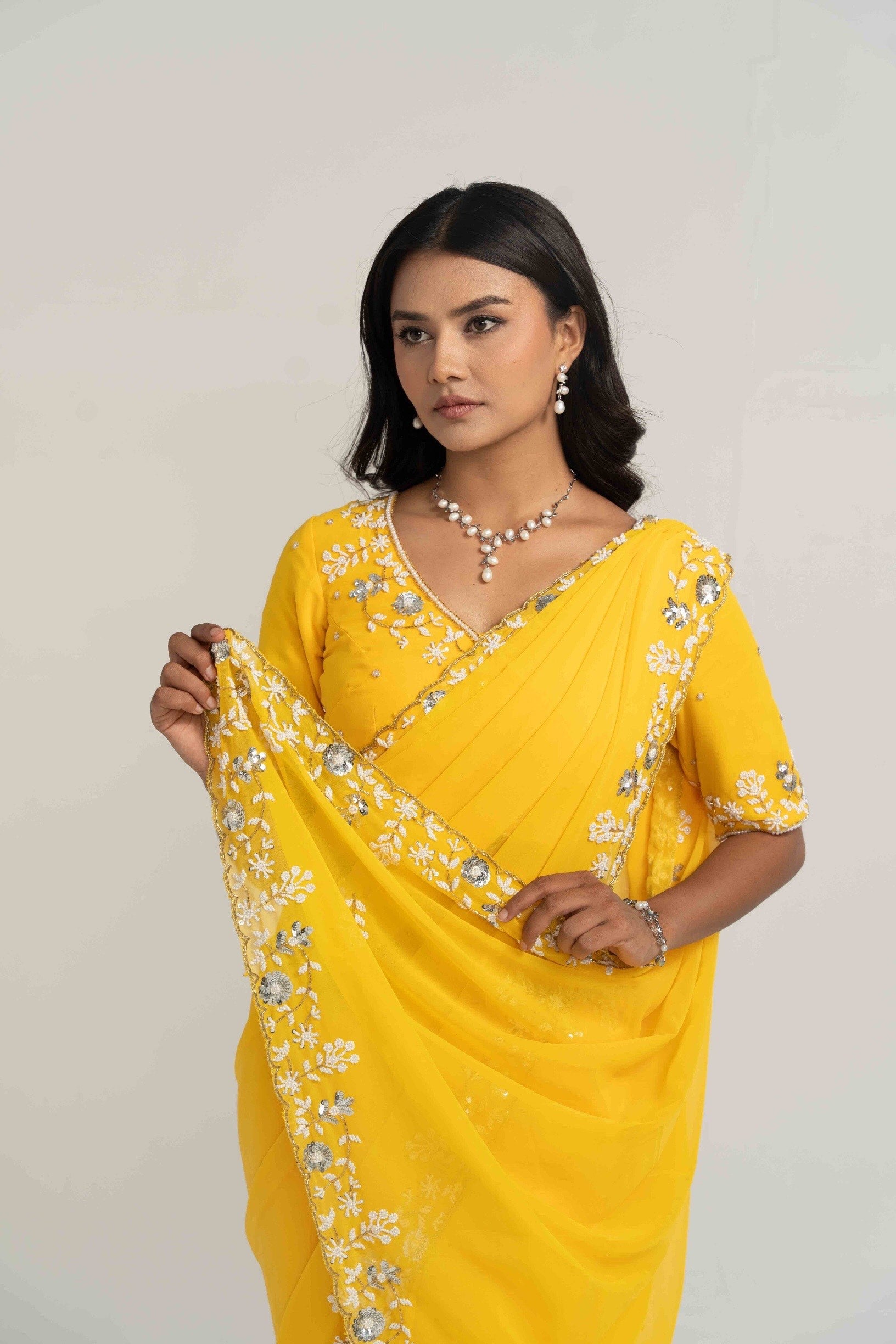 Radiant, warm and full of life, Nam which means Sun in the Limbu language. Bright yellow colour brings joy to every step to take. Carefully hand embellished with delicate beads and sequins. Perfect for festive, pujas and pre wedding events.